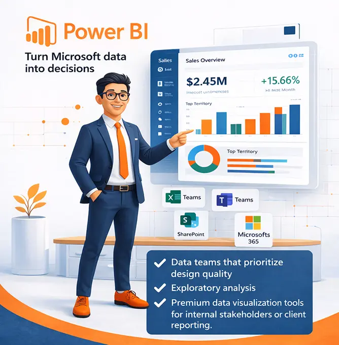 Power BI is one of the most practical choices for companies that already work inside the Microsoft ecosystem. Microsoft describes it as a unified, scalable platform for self-service and enterprise BI, and that positioning is exactly why it appeals to small businesses, mid- sized firms, and larger enterprises alike. It connects naturally with Excel, Microsoft 365, and broader Microsoft data workflows, making adoption easier for teams that do not want a steep learning curve.